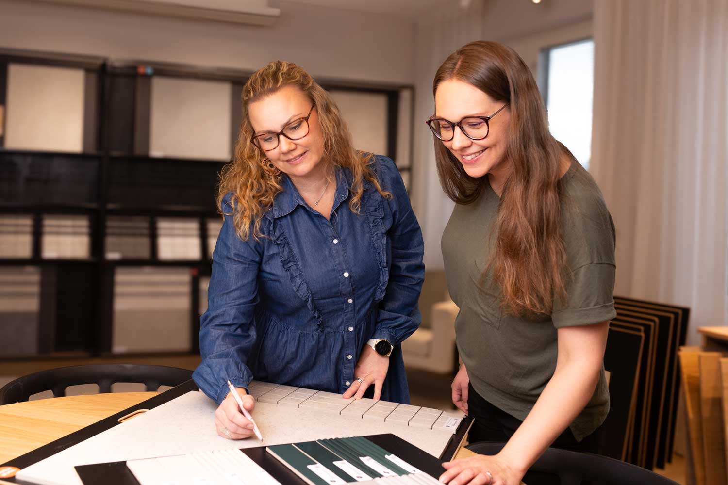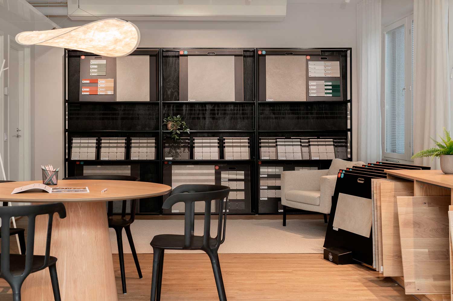 Our showroom is an inviting and harmonious space for making decisions. Its earthy tones create a calming, homelike atmosphere that makes it easier to compare materials. Decision-making is simplified when you can see and experience the materials in full scale and under different lighting conditions. The generous space also allows you to compare multiple options side by side and focus on finding the solutions that best suit your home. Our experienced experts are on hand to guide you through the choices, offering practical advice and insights tailored to your needs.
